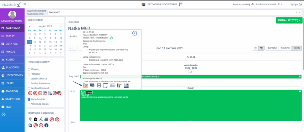 Jeżeli chcesz poinformować pacjenta o zmianie terminu wizyty automatycznie w formie wiadomości SMS, w tym celu najedź kursorem myszki na daną wizytę.