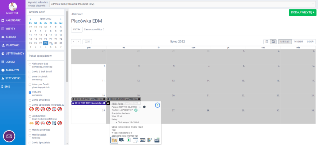 Aby wysłać wiadomość SMS do pacjenta po zmianie powiadomienia w edycji wizyty, w tym celu w zakładce KALENDARZ najedź kursorem myszki na daną wizytę, a następnie w oknie informacyjnym do wizyty kliknij w ikonę edycji.