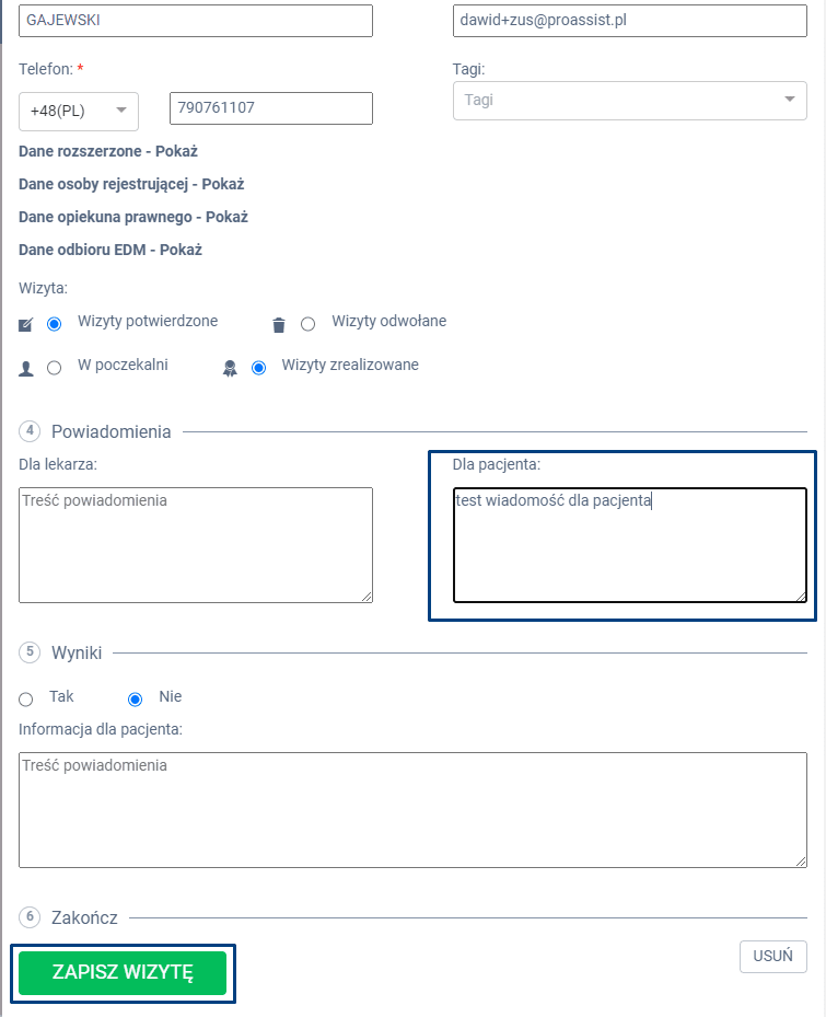 W oknie edycji wizyty w punkcie 4 Powiadomienia, w sekcji Dla Pacjenta, wpisz odpowiednią treść, a następnie kliknij w zieloną zakładkę ZAPISZ WIZYTĘ.