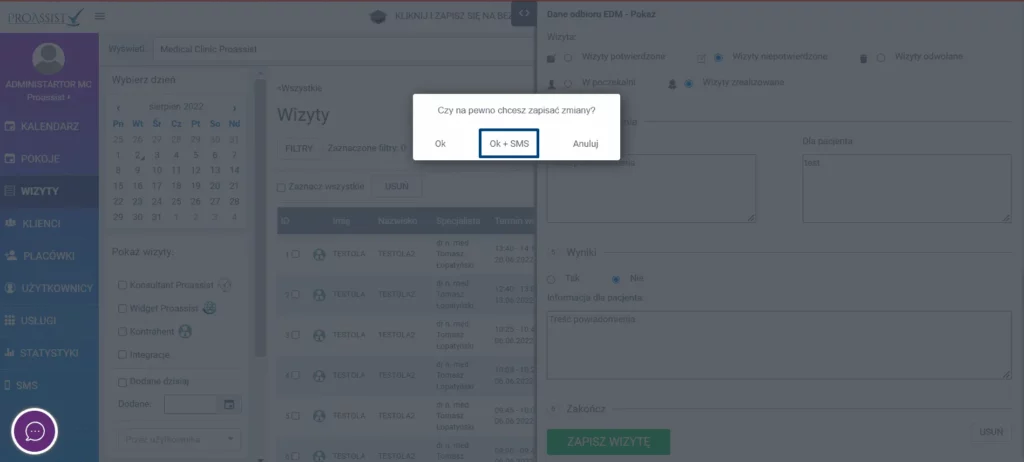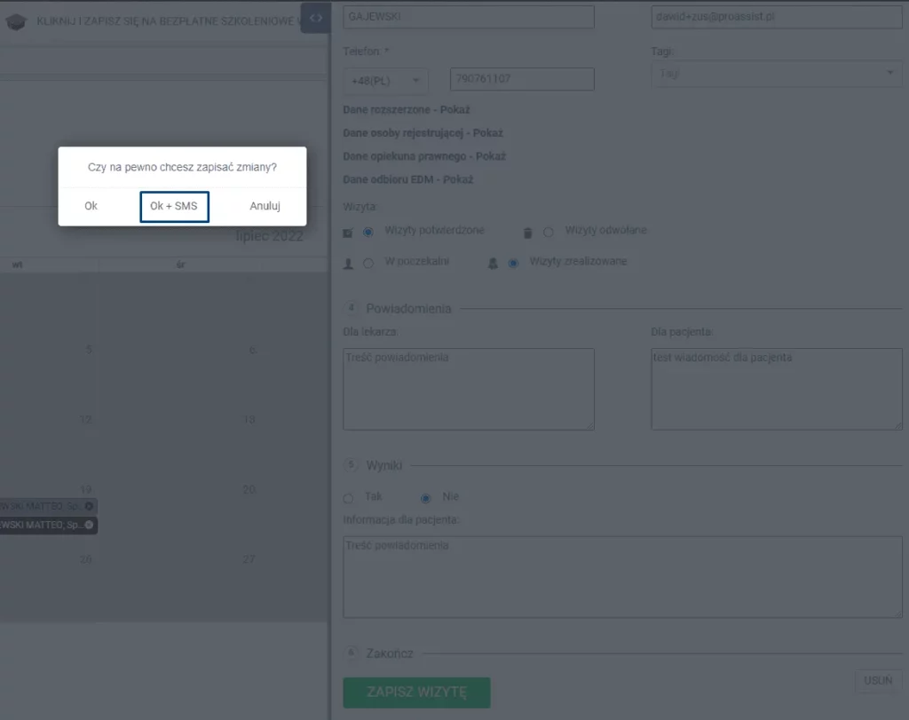 Wysyłka wiadomości SMS po zmianie powiadomień w edycji wizyty #