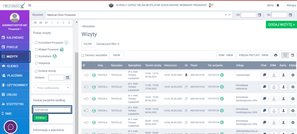 Ta sama możliwość jest również z zakładki WIZYTY. W tym celu z bocznego menu kliknij w zakładkę WIZYTY, a następnie wyszukaj odpowiedniej wizyty wprowadzając dane pacjenta w sekcji Szukaj pacjenta według. Po wpisaniu danych zatwierdź wyszukiwanie klikając w zieloną zakładkę SZUKAJ. Na liście wizyt pacjenta, kliknij w ikonę edycji przy właściwym terminie.