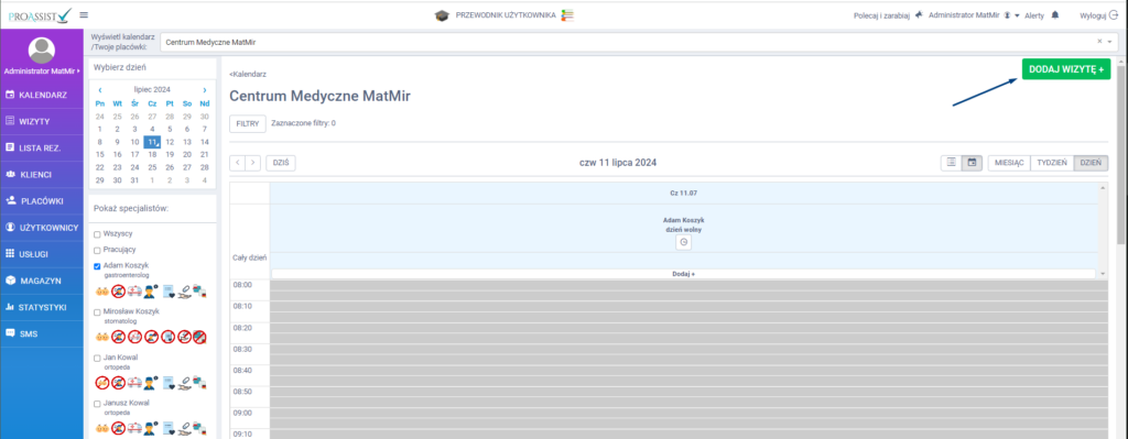 1️⃣Aby zapisać pacjenta na najbliższy wolny termin, z pozycji kalendarza kliknij DODAJ WIZYTĘ+ w prawym górnym rogu.