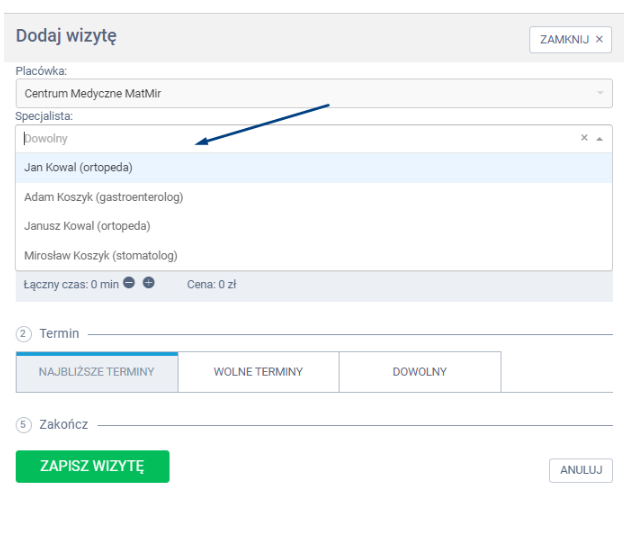 2️⃣W panelu bocznym wysuwanym możesz wybierz specjalistę do którego chce się zapisać pacjent lub pozostaw selekt pusty – jeśli pacjent nie ma preferencji względem specjalisty.