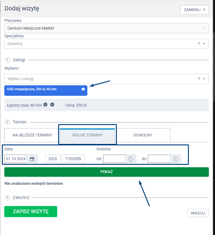 Po określeniu odpowiednich parametrów kliknij w zakładkę POKAŻ, aby system mógł wyświetlić dostępne terminy.