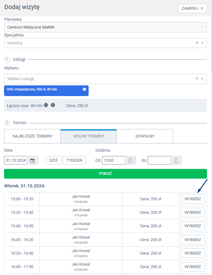 5️⃣Obok konkretnego terminu, który odpowiada pacjentowi kliknij w zakładkę WYBIERZ.