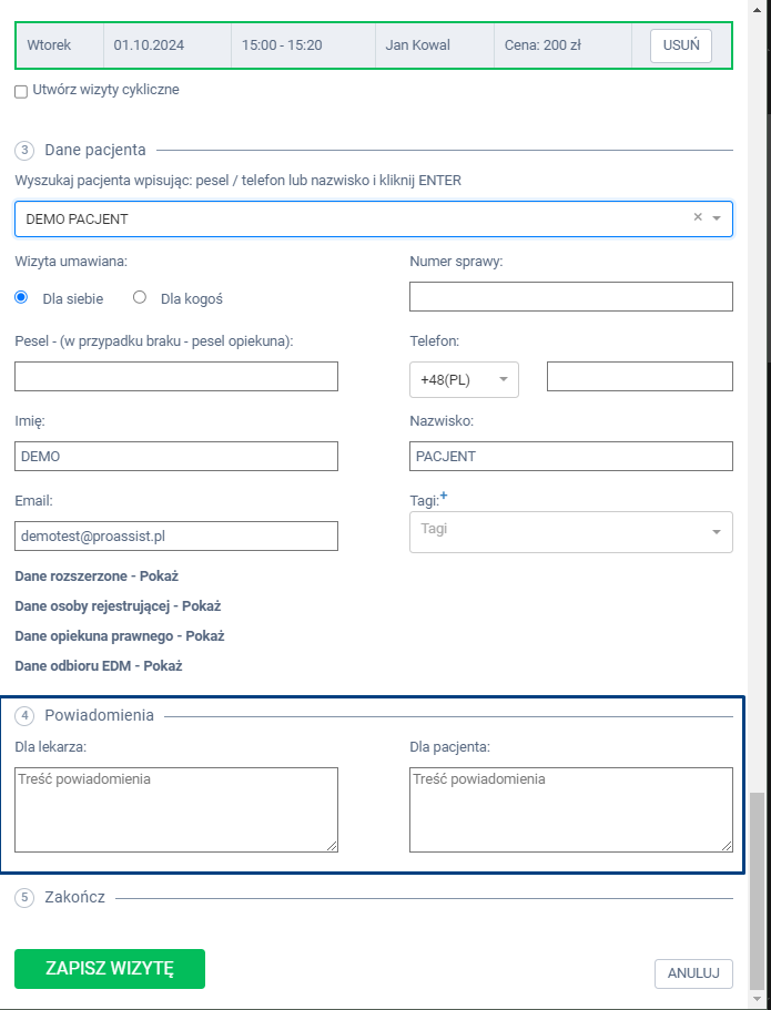 Dla pacjenta: wiadomość ta zostanie wysłana do pacjenta wraz z wiadomością SMS z przypomnieniem o wizycie. (np. proszę zabrać wyniki badań).